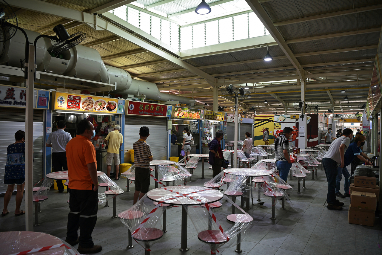 People observe social distancing at Lorong 8 Toa Payoh Hawker Centre, on April 28, 2020.