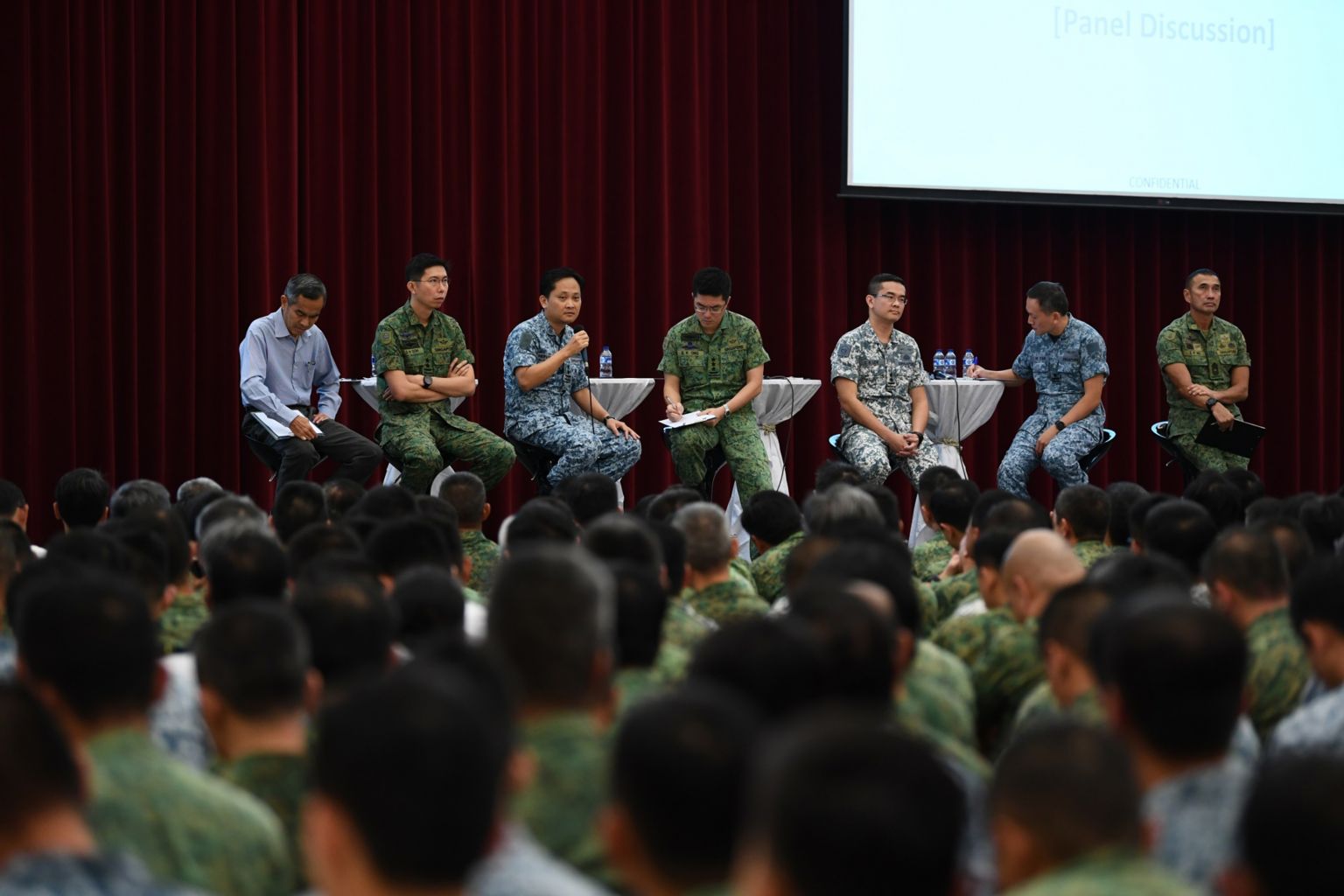Chief of Defence Force Melvyn Ong (centre) with Chief of Army Goh Si Hou (second left), Chief of Air Force Mervyn Tan (third left), Chief of Navy Lew Chuen Hong (third right) during a panel discussion at the SAF Command Call, on Jan 31, 2019.