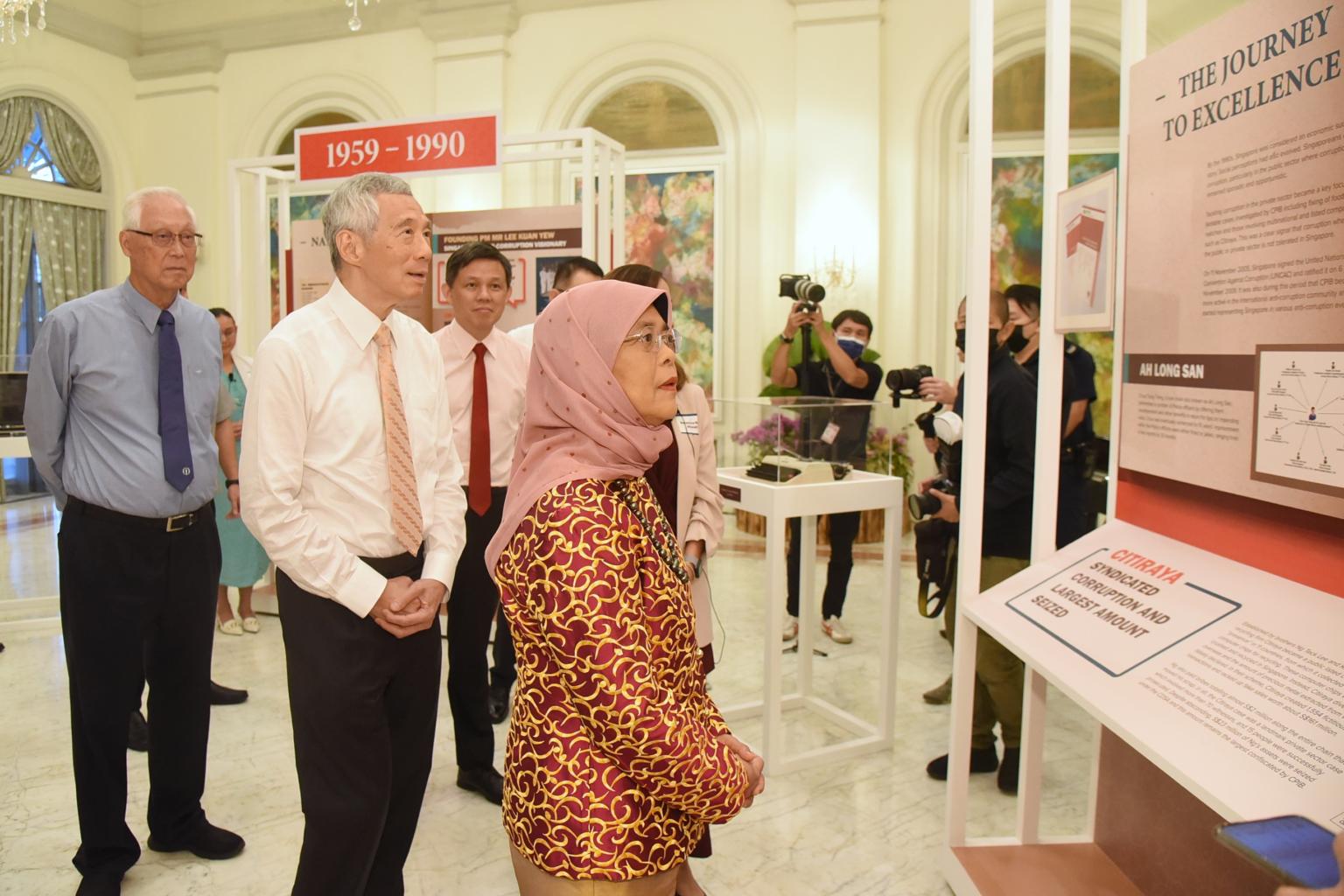 (From left) ESM Goh Chok Tong, Prime Minister Lee Hsien Loong, Minister Chan Chung Sing and President Halimah Yacob view a CPIB exhibition at the Istana on Sept 21, 2022.