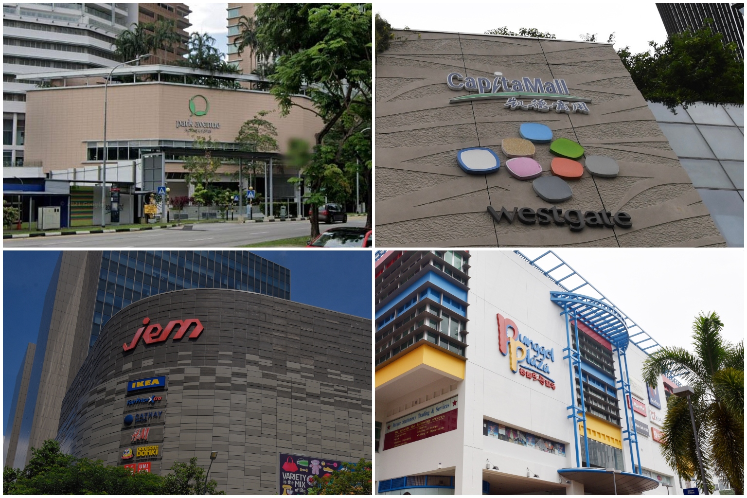 A cleaner at Park Avenue Rochester (top left) may be the source of the cluster at Westgate (top right) and Jem (bottom left). Four Pizza Hut staff in Punggol Plaza were also among the new cases.