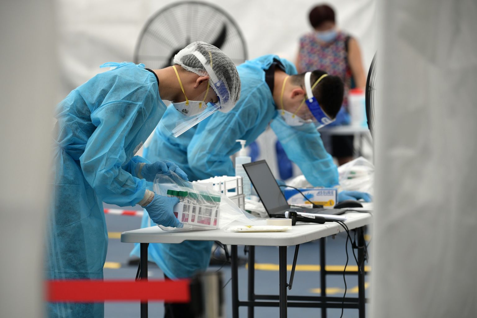 Staff at the Covid-19 test centre at Block 685A Hougang Street 61 packing swab samples on June 5, 2021.