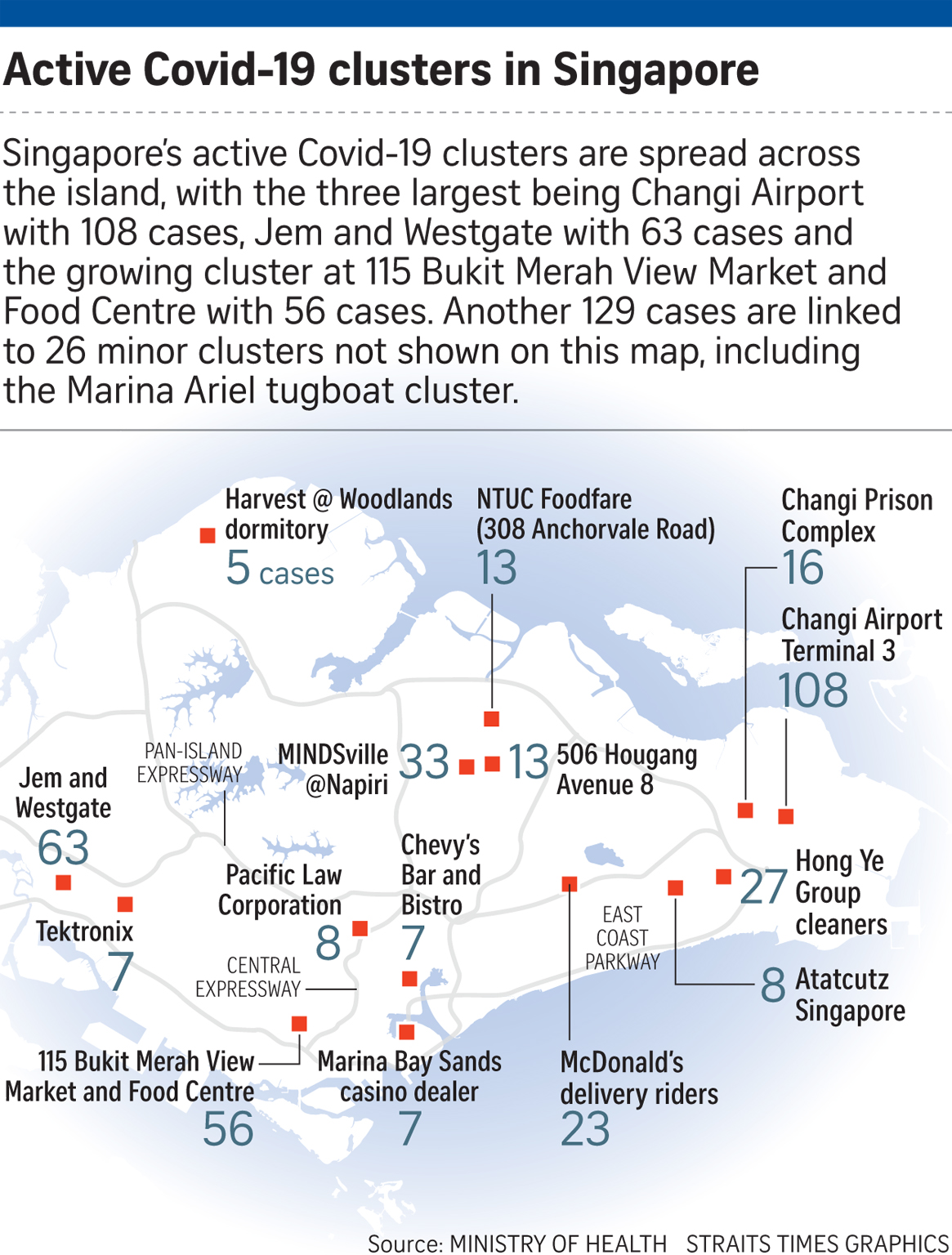 The three largest open clusters as at last night were the Changi Airport cluster in the east with 108 cases, the Jem and Westgate cluster in the west with 63 cases, and the Bukit Merah View market and food centre cluster in the south with 56 cases.