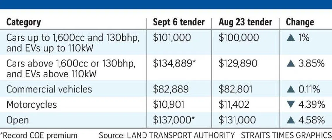 The premium for Open category COEs, which can be used for any vehicle type except motorcycles, but end up mostly for bigger cars, surged by 4.58 per cent from $131,000 to $137,000.