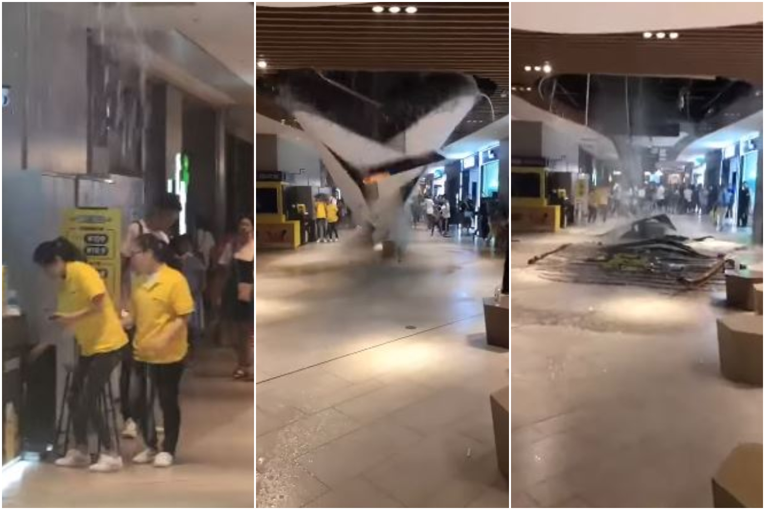 Customers at the mall are seen stepping away from the area where the leak is, before a portion of ceiling collapses under the weight of water.