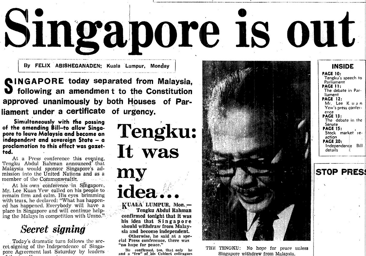 Singapore becomes independent following its shocking separation from Malaysia on Aug 9, 1965. The Straits Times keeps its measured approach in a bid to calm the situation.