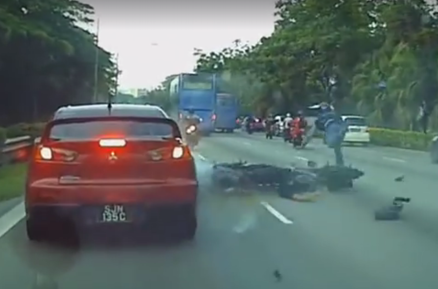 A dramatic dashboard video of a motorcycle being flung at high speed across two lanes of the Pan-Island Expressway (PIE) after colliding with a car has shocked users online.