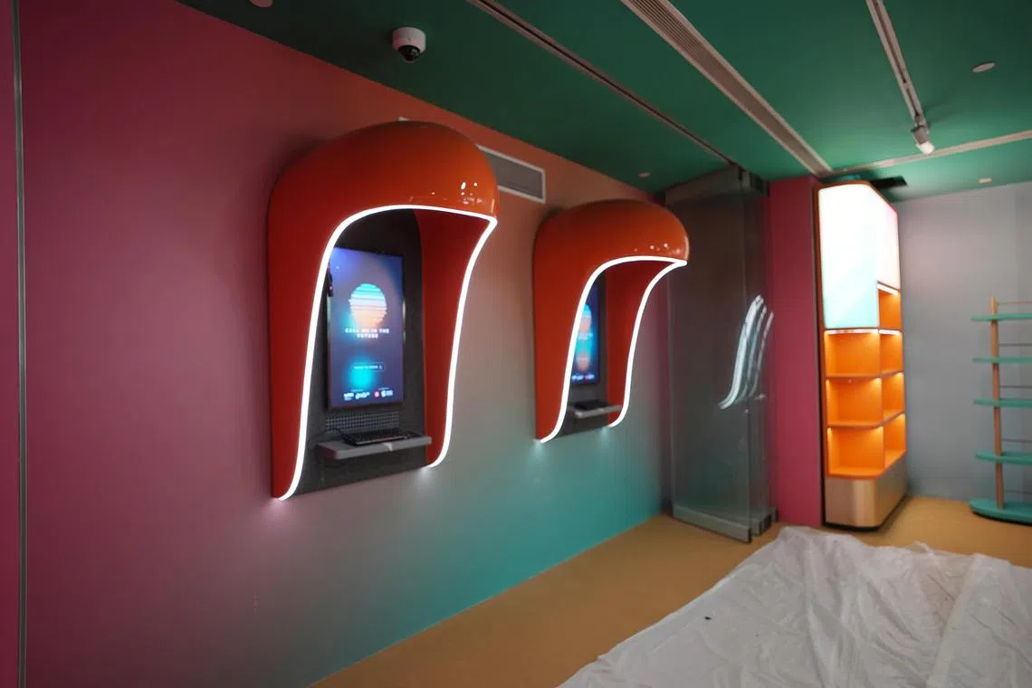 First stop: Visitors chat with a lifelike digital librarian at phone booths with a retro look. They fill the librarian in on their interests. Chats are available in four languages: English, Malay, Mandarin and Tamil. The information shared is used to envision each visitor’s future.