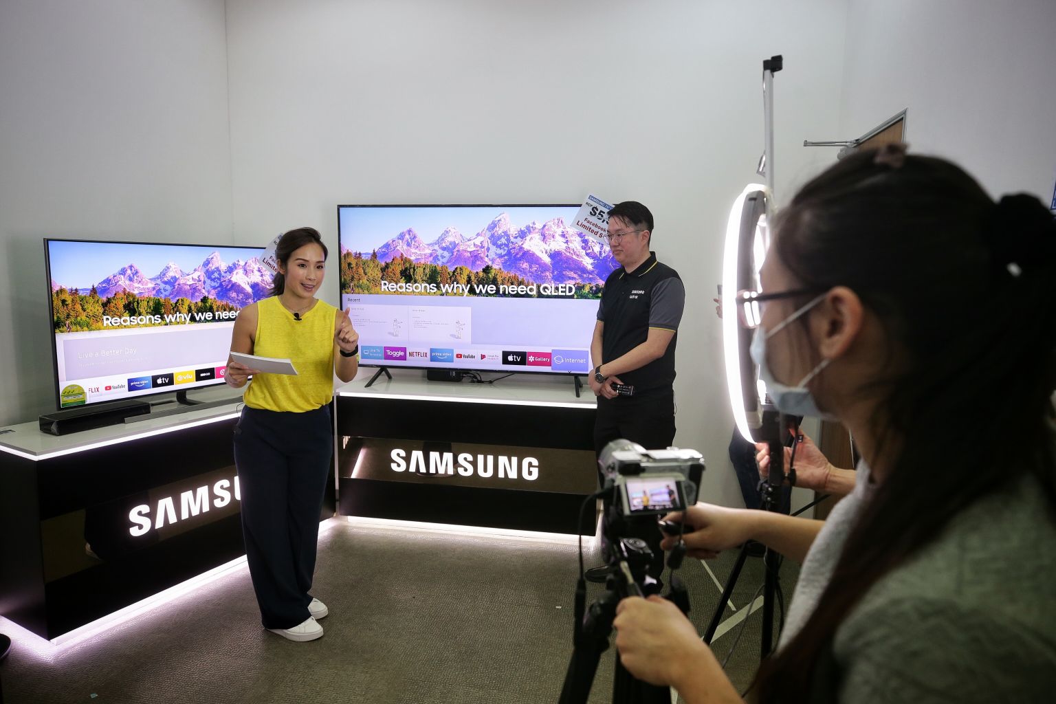 Host Victoria Cheng and Samsung product specialists Ace Tay introducing a Samsung TV during a Comex virtual event on Sept 3, 2020.