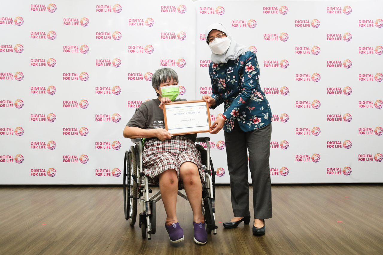Ms Ng May Chan, who participated in the Digital Enablement Programme, receiving her certificate of completion from President Halimah Yacob on Nov 16, 2021.