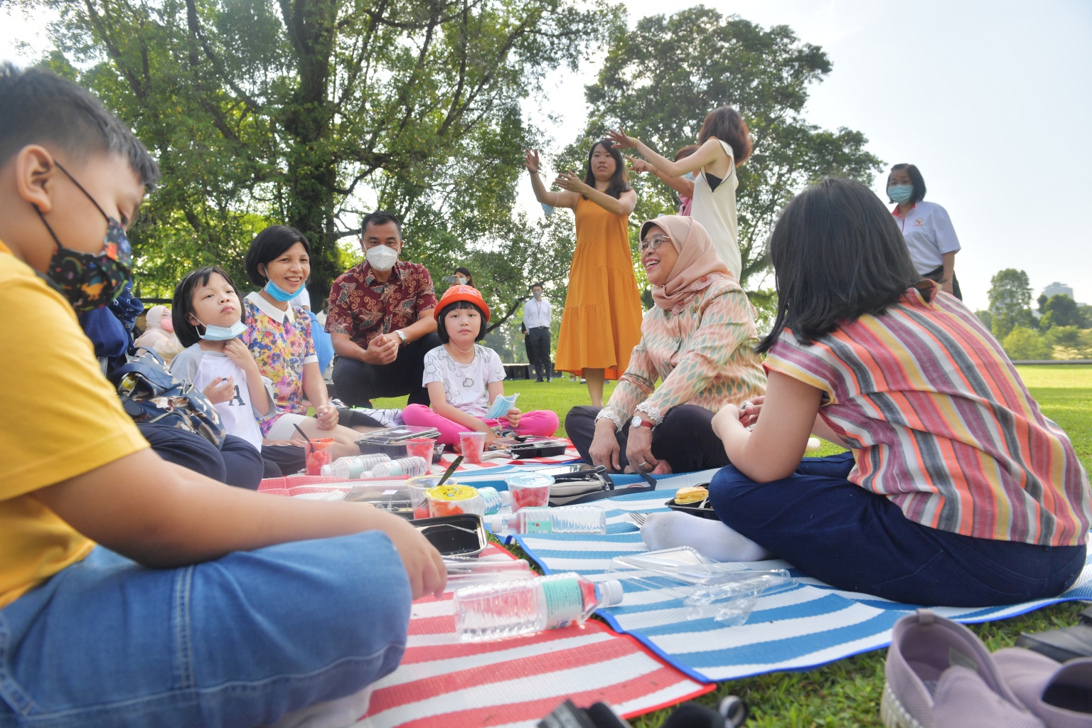 President Halimah Yacob with families on May 23 at the first Picnic@Istana since the onset of the Covid-19 pandemic.