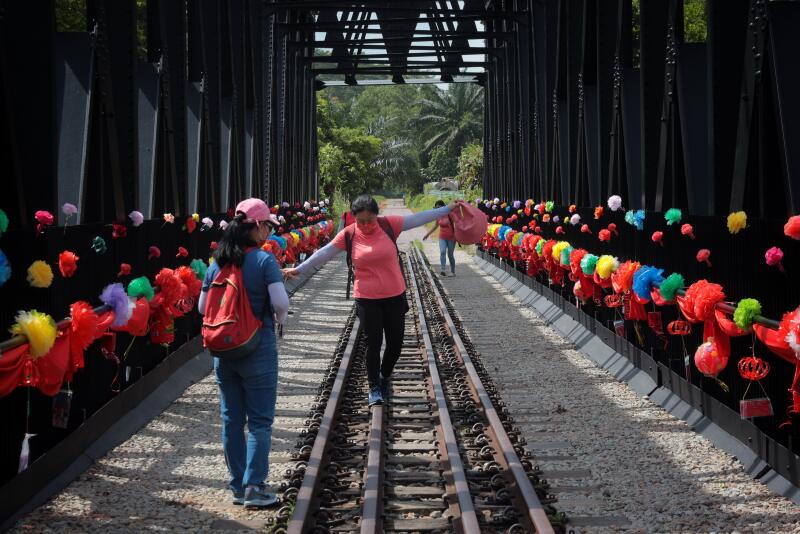 Bukit Timah Truss Bridge adorned with lanterns and flowers handcrafted by volunteers, on Feb 3, 2021.