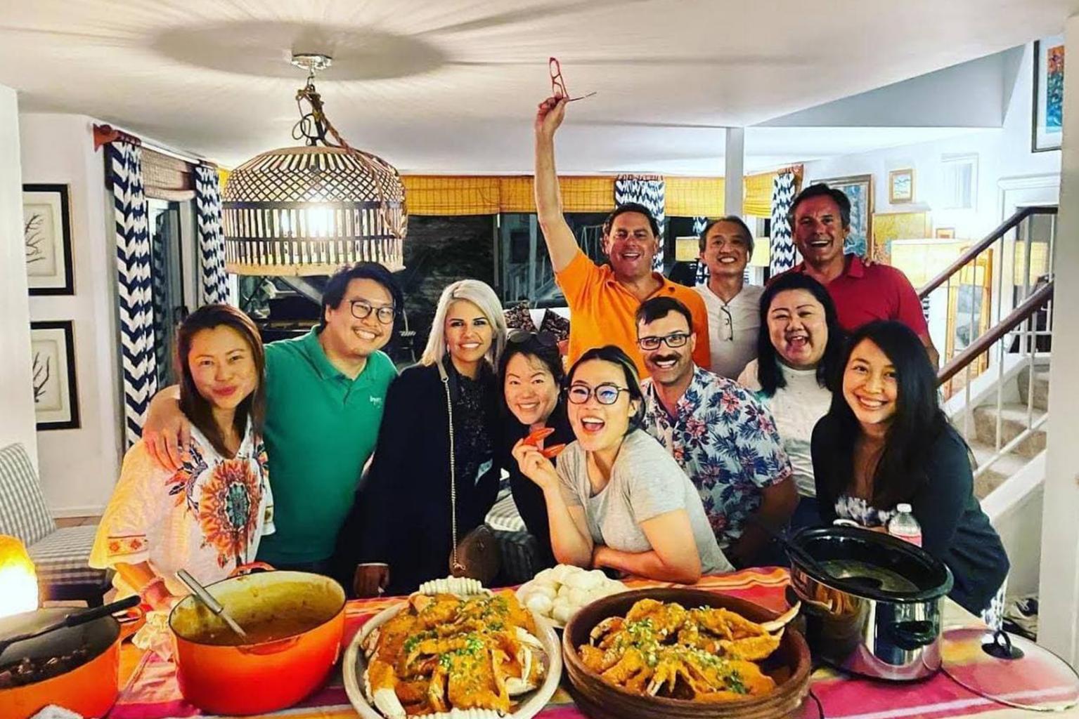 SingaporeConnect co-founder Jasmin Young (front middle, in black top) at a party in Southern California in June, which featured a chilli crab dish.