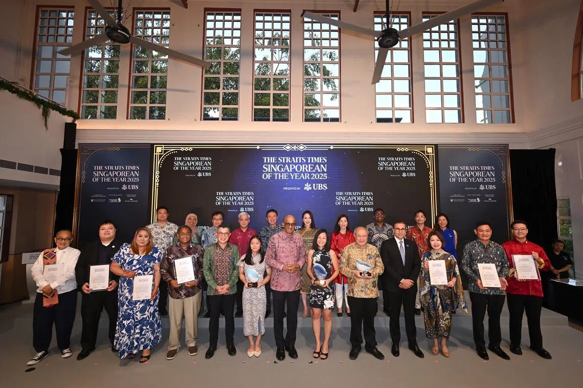 (Front row, from left) ST Singaporean of the Year 2025 finalists Edmund Wee, Robert Sim, Lydia Susiyanti Sukarbi and Ganesh Kumar; ST editor Jaime Ho; ST Young Singaporean of the Year award winner Amanda Yap; President Tharman Shanmugaratnam; ST Singaporean of the Year award winner Chen Shiling; ST Singaporean of the Year (International Impact) award winner Robert Kee; Mr Iqbal Khan, president of UBS Asia-Pacific and co-president of UBS Global Wealth Management; and the other ST Singaporean of the Year 2025 finalists Peggy Yee, Steven Goh and Darryl Lee. (Back row, from left) Singapore National Olympic Council vice-president Mark Chay; New Life Stories CEO Saleemah Ismail; Mr Wong Wei Kong, editor-in-chief for the English, Malay and Tamil Media Group at SPH Media; SPH Media CEO Chan Yeng Kit; UBS Asia-Pacific chairman Edmund Koh; Ms Young Jin Yee, UBS’ Singapore country head and co-head for global wealth management for the Asia-Pacific; Ms Patricia Quek, UBS’ head of wealth management for Singapore and Malaysia; SIA’s divisional vice-president of public affairs Siva Govindasamy; Millennium Hotels and Resorts executive director Kwek Eik Sheng; and Temasek Shophouse CEO Yvonne Tay.