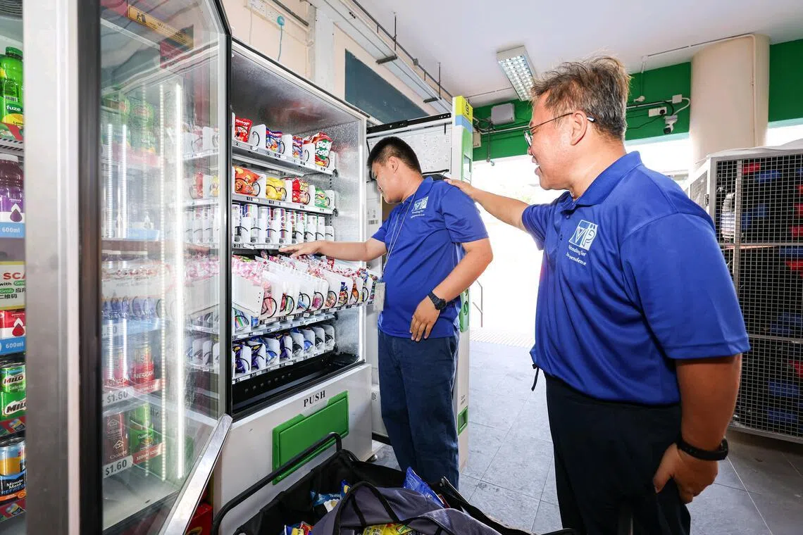 Mr William Tan encouraging his son Cairn Tan as he restocks the snack vending machine at Bukit Panjang Community Club on April 6.