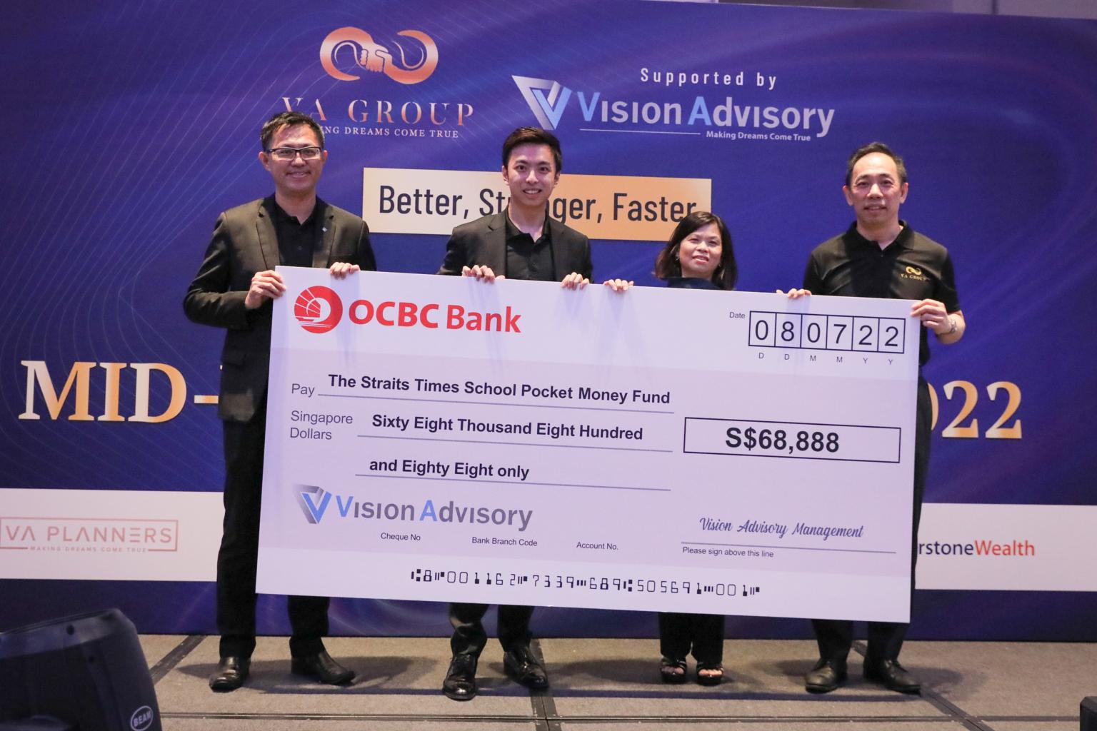 Mr Bentley Cheng (second from left) presenting a cheque on behalf of 30 donors from Vision Advisory Management on July 8.