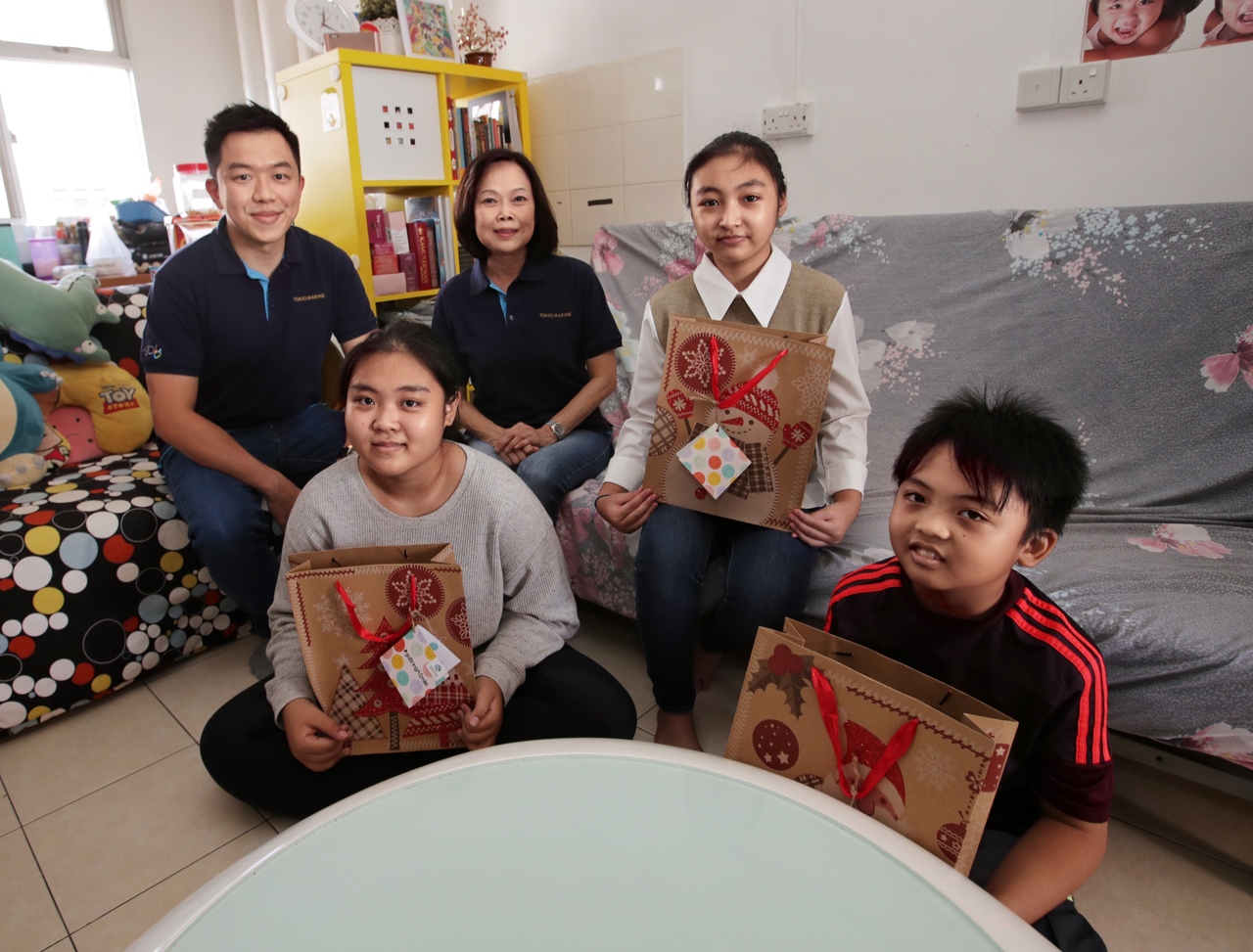 Siblings Alisha Itoi Muhammad Iman, 14, Humairah Itoi Muhammad Iman, 13, and Khalis Itoi Muhammad Iman, nine, were thrilled to receive their presents from Tokio Marine representatives who visited their Hougang flat on Tuesday (Dec 7). The other children will receive their gifts by the end of this week.