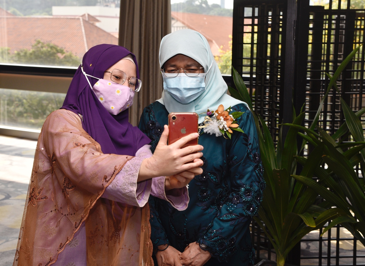 Exemplary Young Mother Award recipient Far'ain Jaffar (left) with President Halimah Yacob at the prize ceremony.