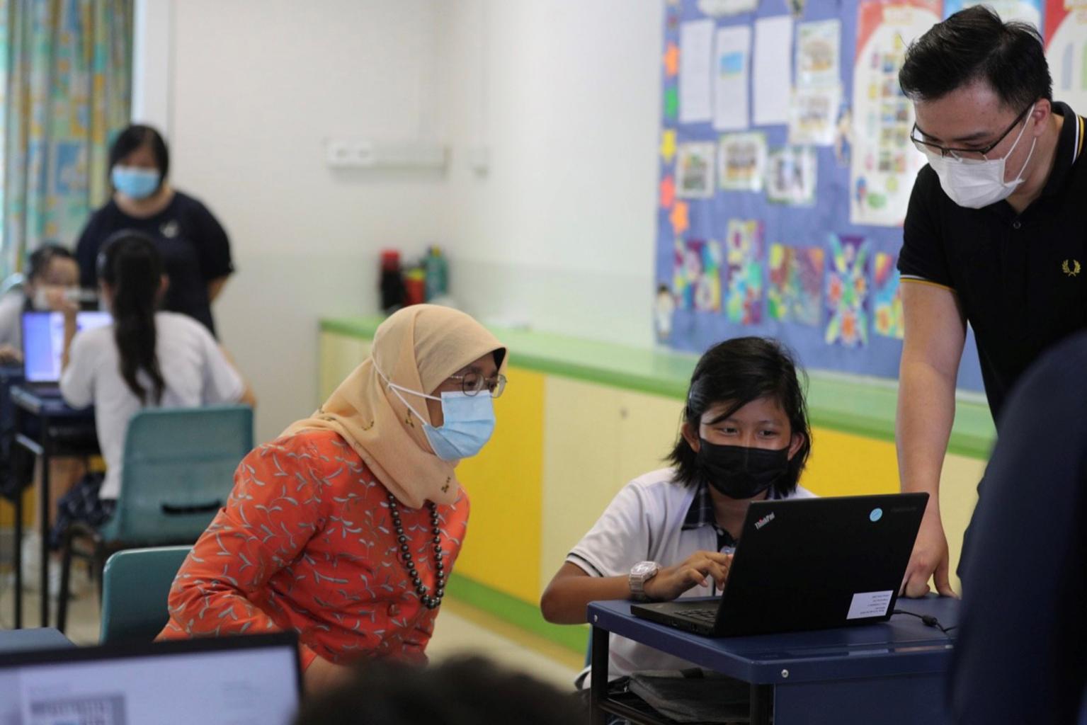 President Halimah Yacob observing a digital literacy workshop at Chua Chu Kang Primary School.