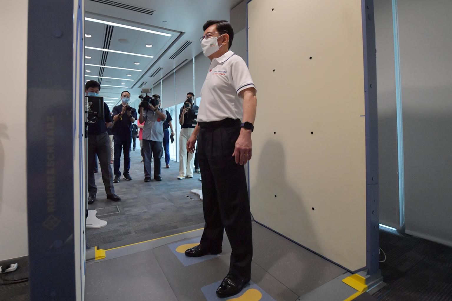 DPM Heng (centre; in white shirt) is briefed during his visit to the Rohde & Schwarz facility in Changi on Oct 30, 2021.