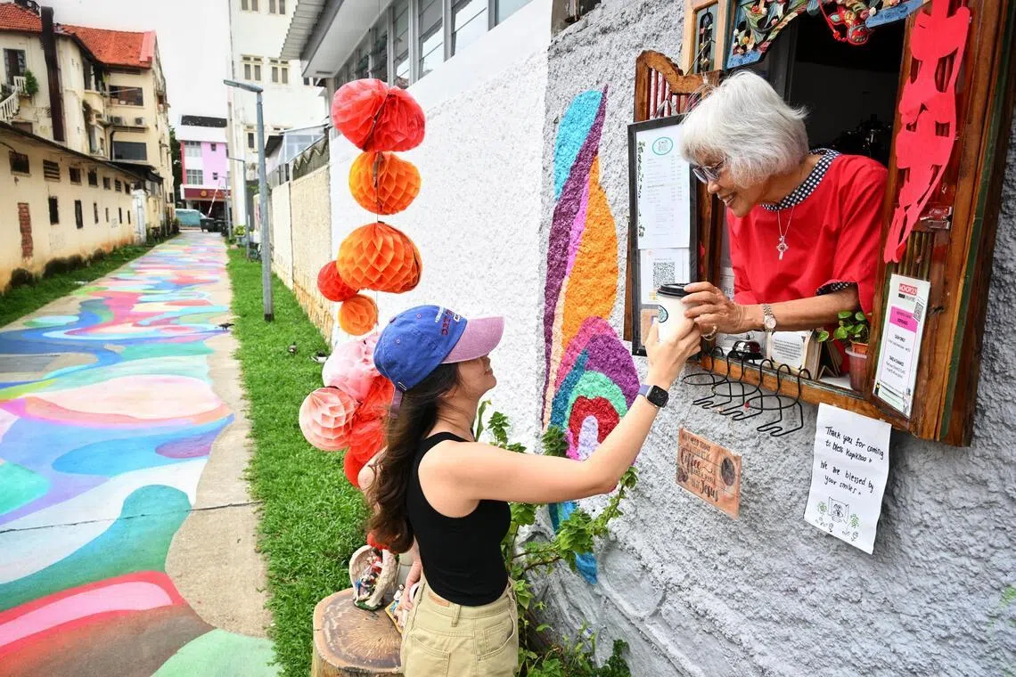 Ms Pauline Ng, 73, owner of Kopi Khoo, a home based coffee business, operated out of a window from the back of her home in an alley near Tembeling Road that was also recently repainted in a myriad of bright colours on Feb 20.
