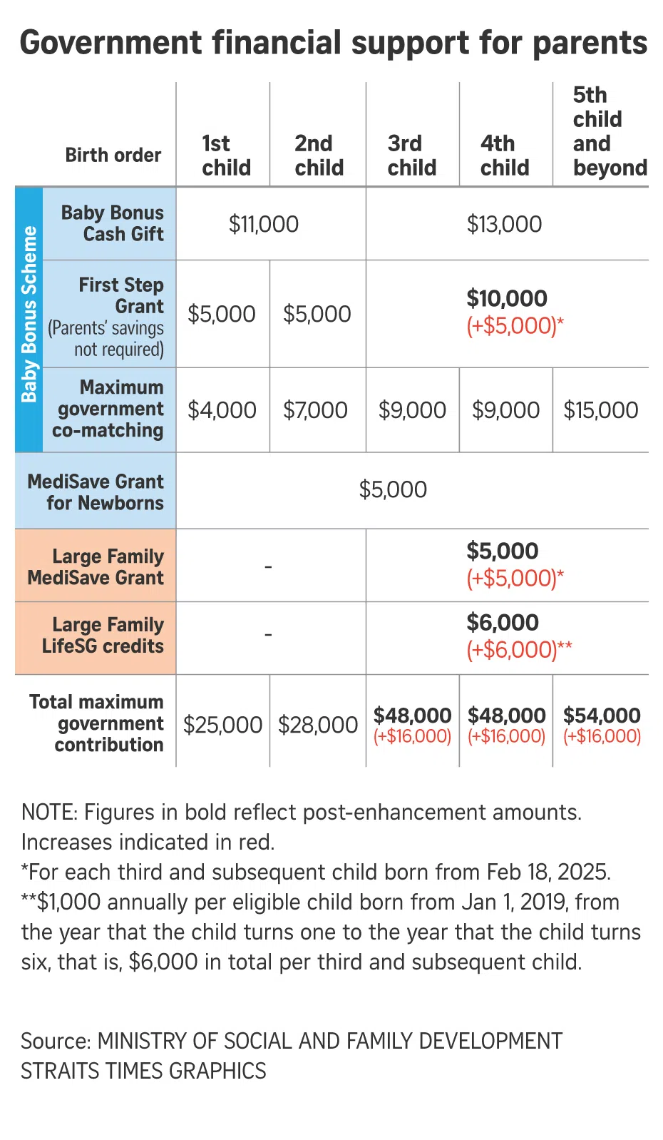 - Families will get $1,000 LifeSG credits annually from Sept 10 for the third or subsequent child aged one to six, usable at various merchants.