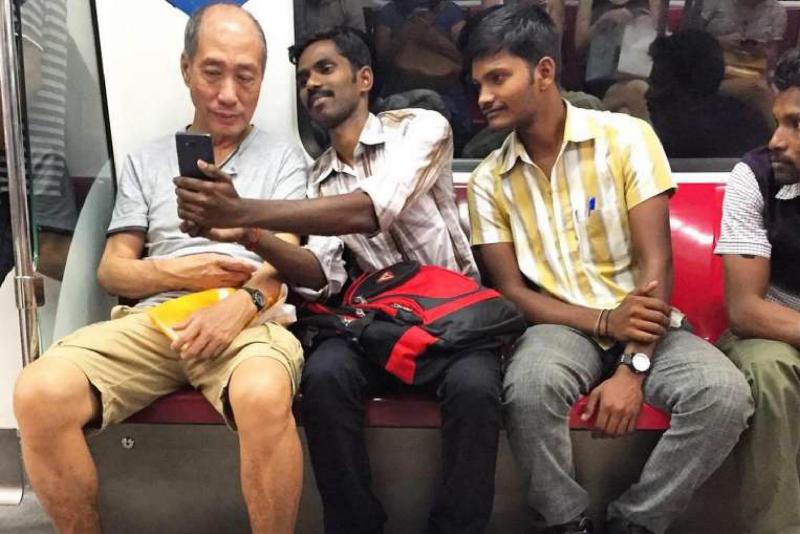 Foreign worker Saravanan Samidurai takes a selfie with Mr Rimy Lau on a train in 2015 after the latter urged him to keep his seat when he got up for other commuters.