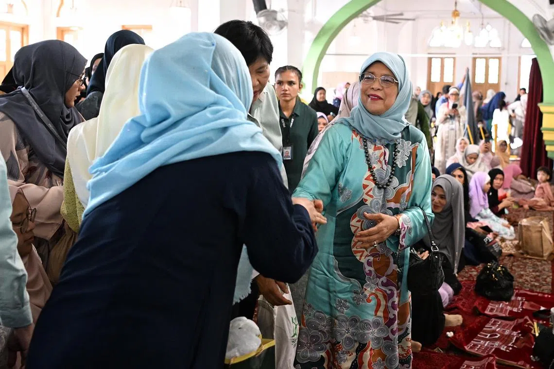 President Halimah Yacob greeting congregants after the first session of Hari Raya Aidilfitri prayers at Sultan Mosque on Saturday.