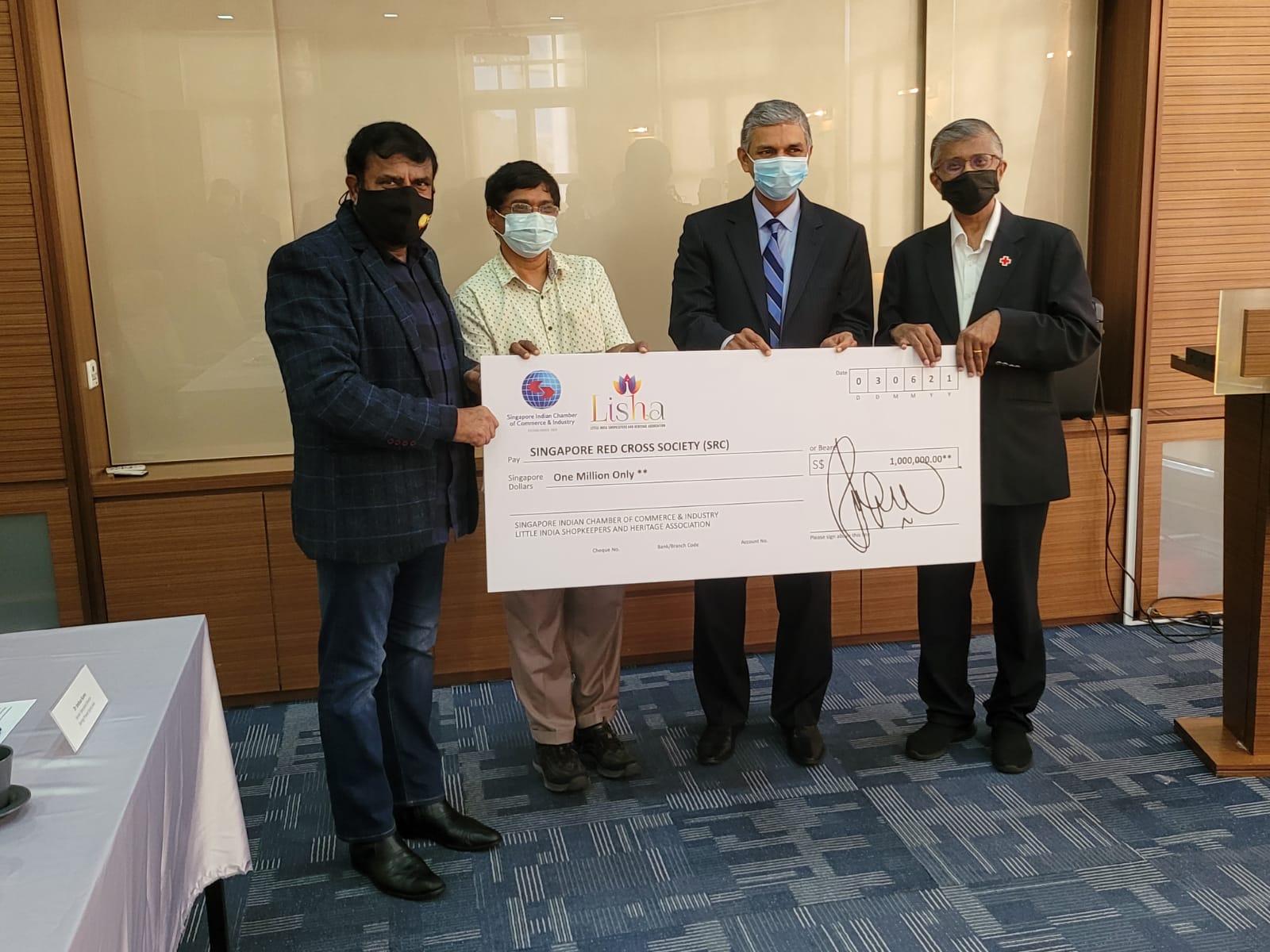Cheque presentation of $1 million from the Singapore Indian Chamber of Commerce and Industry and the Little India Shopkeepers' Association to Singapore Red Cross, on June 3, 2021.