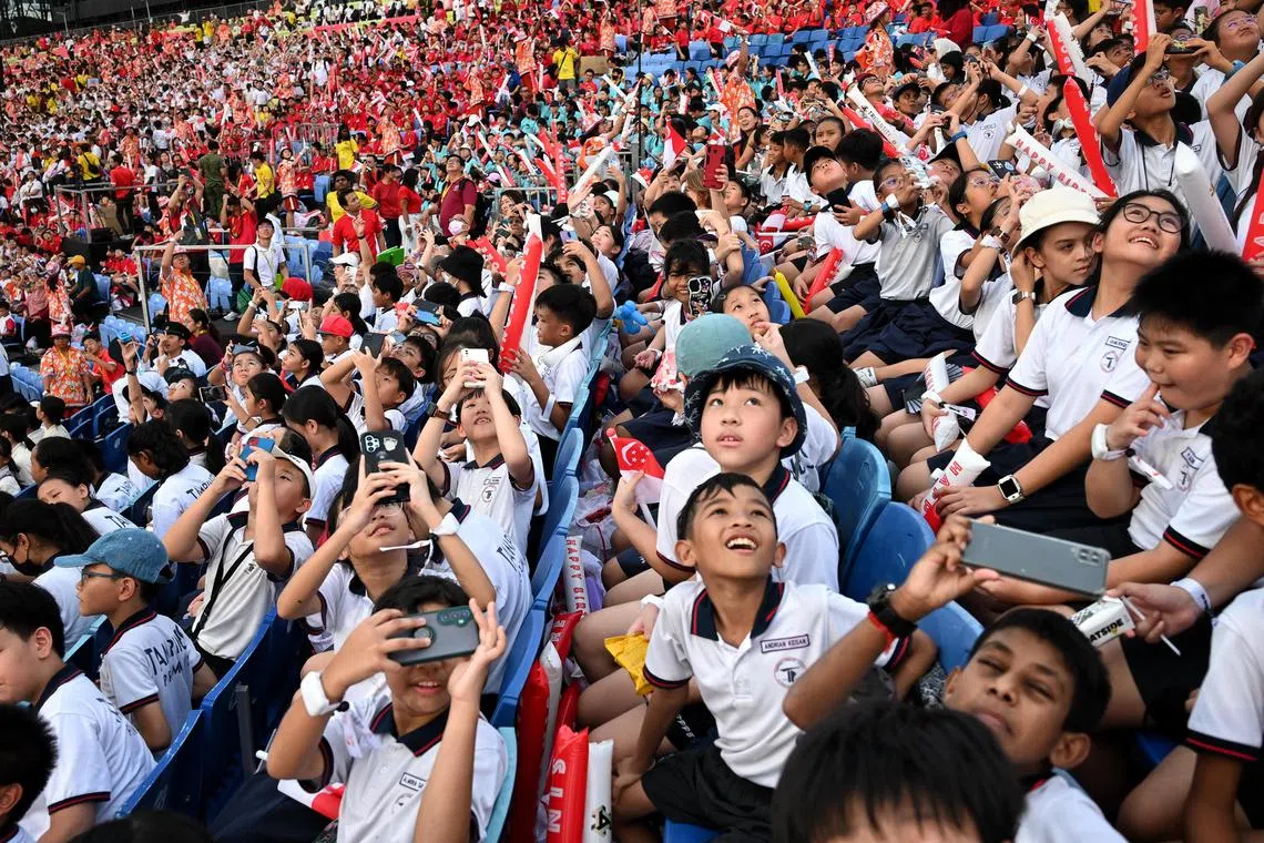 Pupils watching an aerial display during the National Day Parade National Education show on June 29.