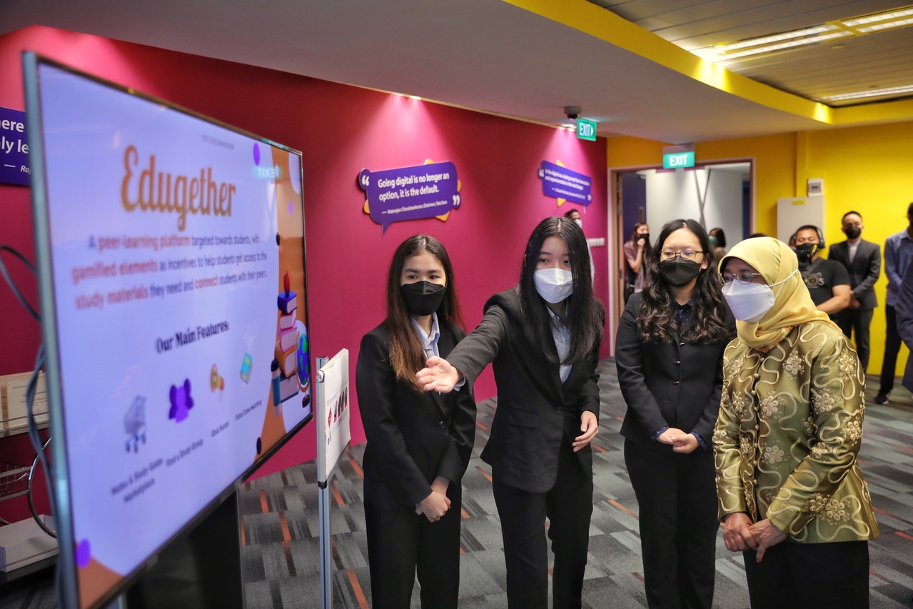 (From left) Ms Ng Yan Qing, Ms Jennifer Poernomo, and Ms Michelle Leong, introducing their peer-learning platform Edugether to President Halimah Yacob, on Jan 12, 2022.