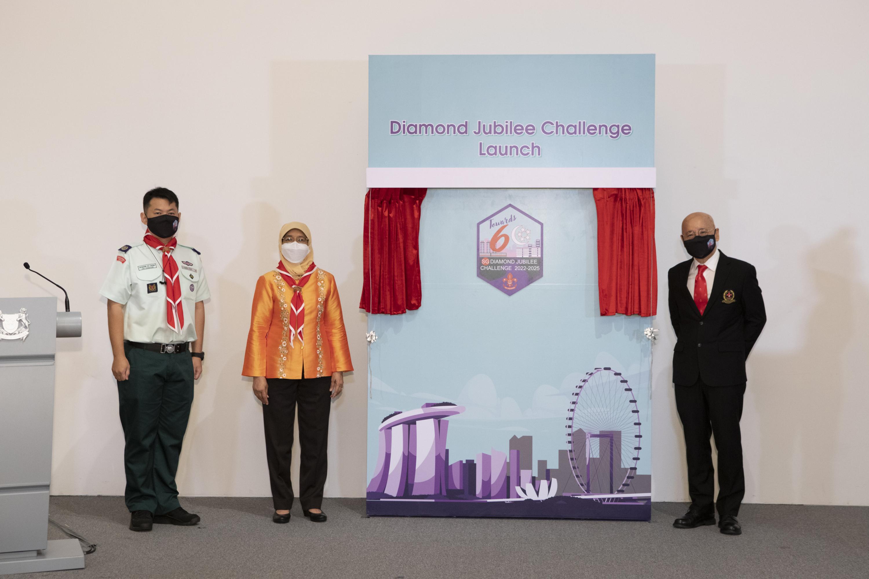 President Halimah Yacob with Singapore Scout Association (SSA) chief commissioner Desmond Chong (left) and SSA vice-president William Wan at the launch of the Diamond Jubilee Challenge at the National Museum of Singapore on Jan 29, 2022.