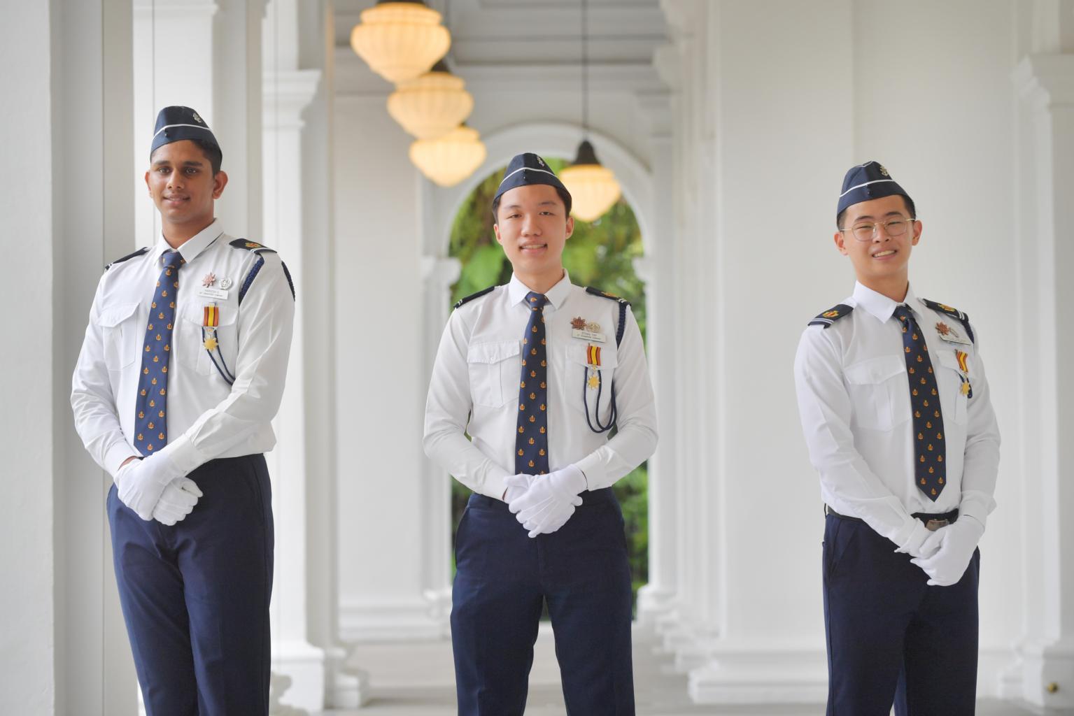 (From left) Hareesh S, Ethan Yap and Justin Lee, winners of The President's Award given to the top cohort of Boys Brigade members, on Dec 14, 2021.