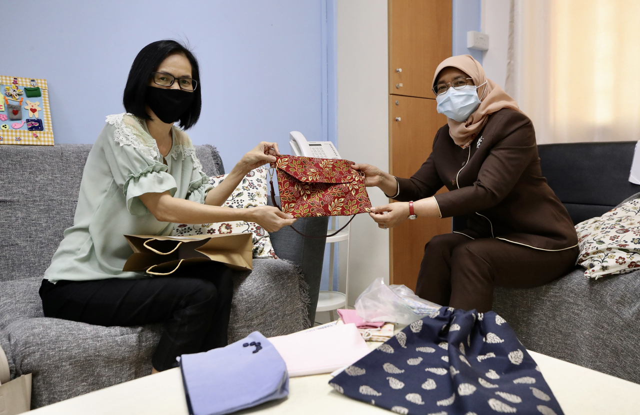 Madam Fan Bee Eng presenting President Halimah Yacob with a handsewn bag at Fei Yue Family Service Centre (Choa Chu Kang).