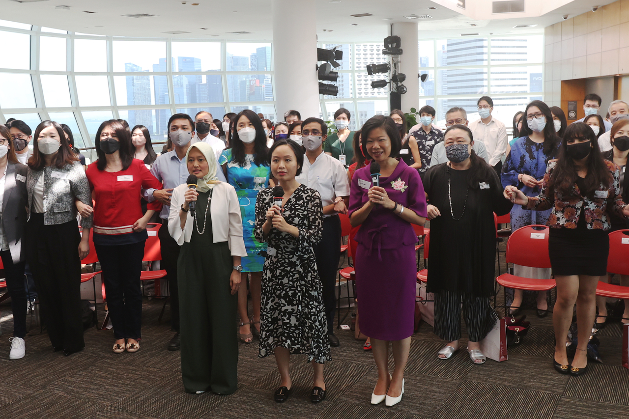 (Front row, from left) Senior Parliamentary Secretary for Health and Law Rahayu Mahzam, Sunlight AfA victim support work scheme coordinator Nadia Yeo and Senior Minister of State for National Development Sim Ann leading the Sunlight pledge on July 27, 2022.