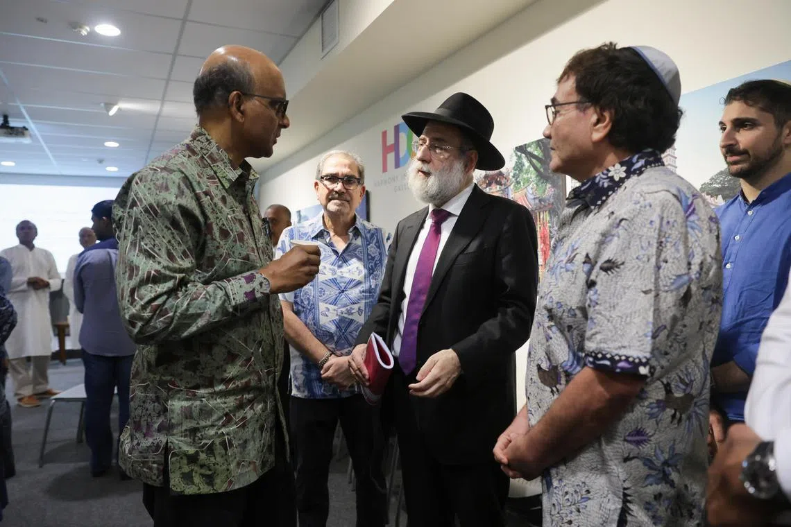 President Tharman Shanmugaratnam speaking to Singapore Chief Rabbi Mordechai Abergel (in black hat) at the Harmony in Diversity Gallery on Oct 22.