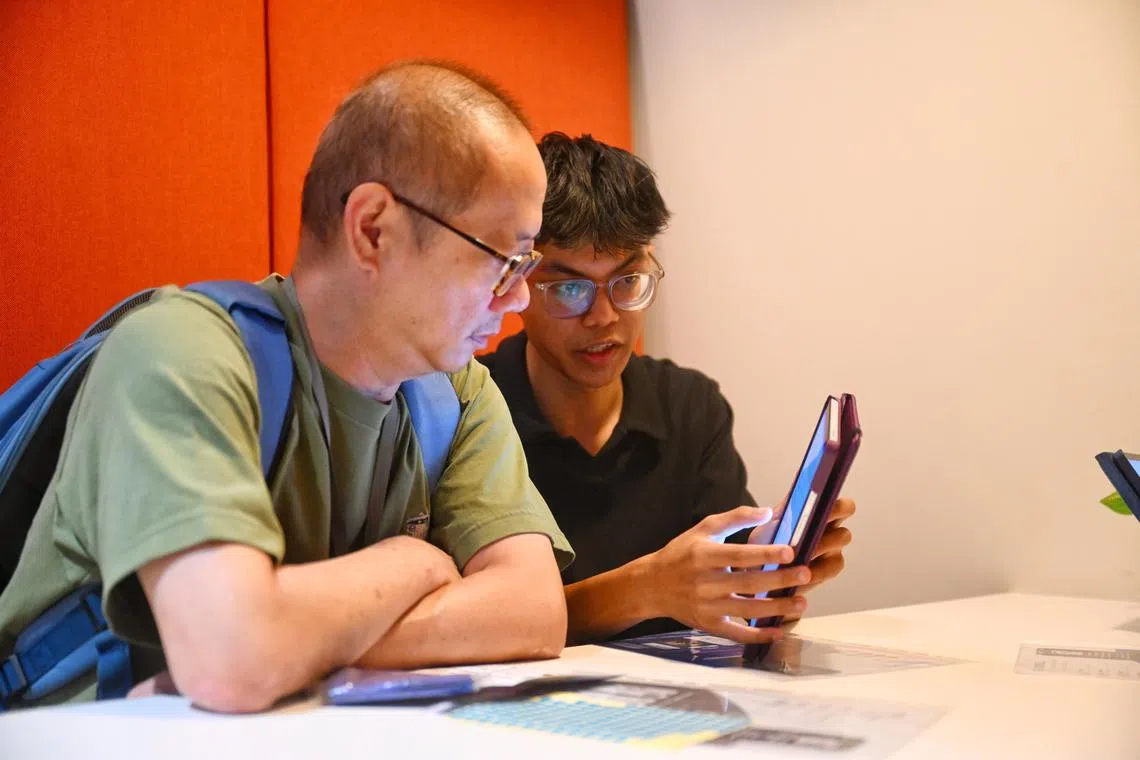 Singapore Association for Mental Health intern Adi Juzaili (right) demonstrating the AI-powered mental health screening application during the SAMH Golden Connect festival.