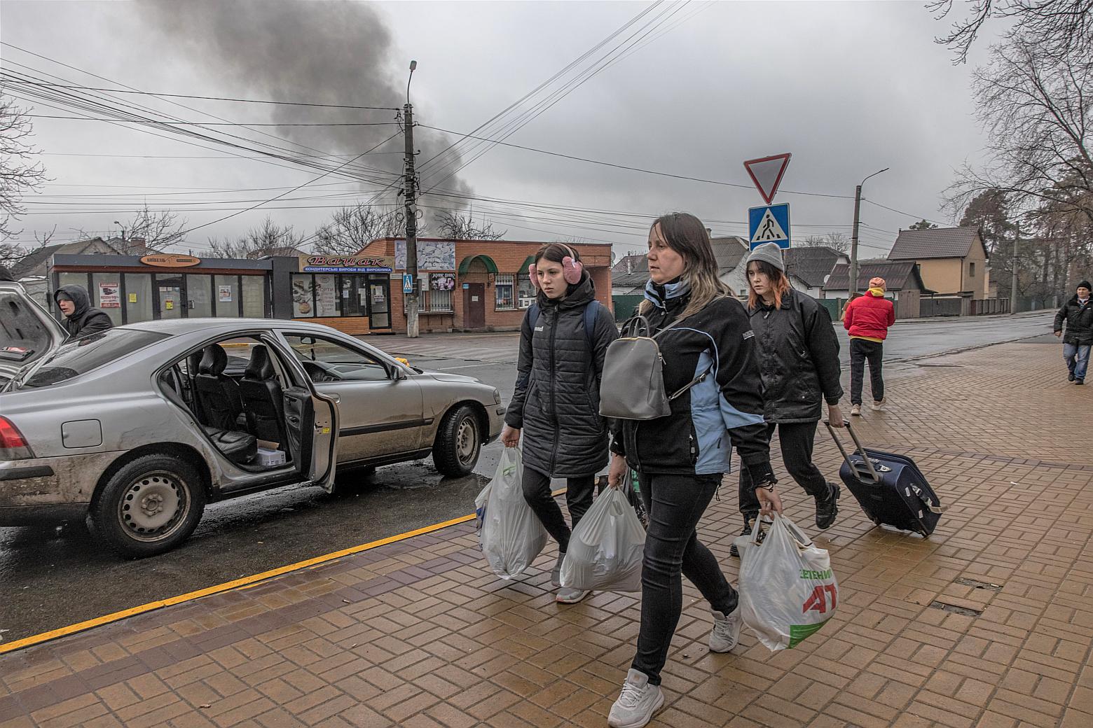 People walk with their belongings as smoke rises from a shelling, in Irpin city, Kyiv, on March 3, 2022.