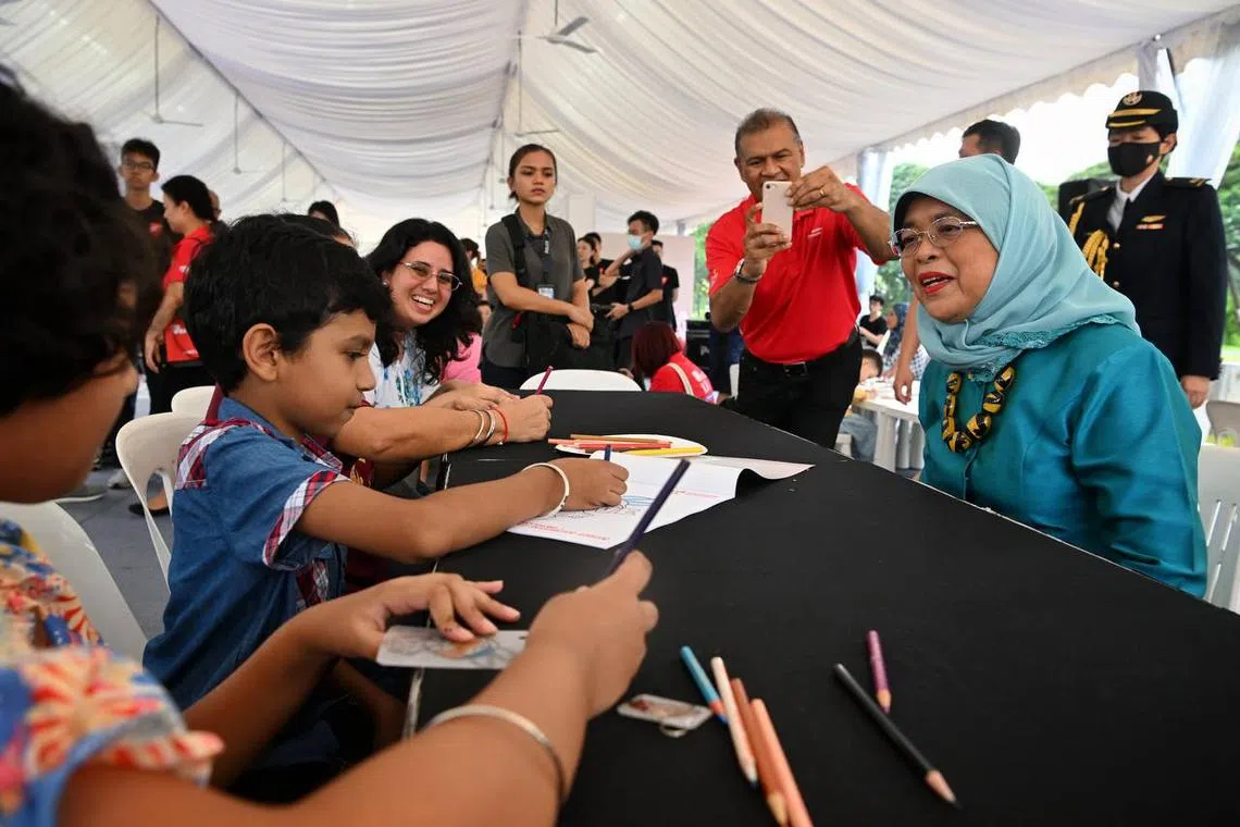 President Halimah Yacob mingling with visitors doing art and craft at the Family Zone at Gardens by the Bay on Nov 26.