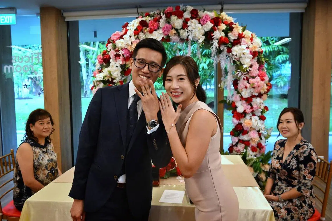 Mr Jesper Tong, 31, and Ms Pamela Leck, 29, after their solemnisation at the Family Zone at Gardens by the Bay on Nov 26.