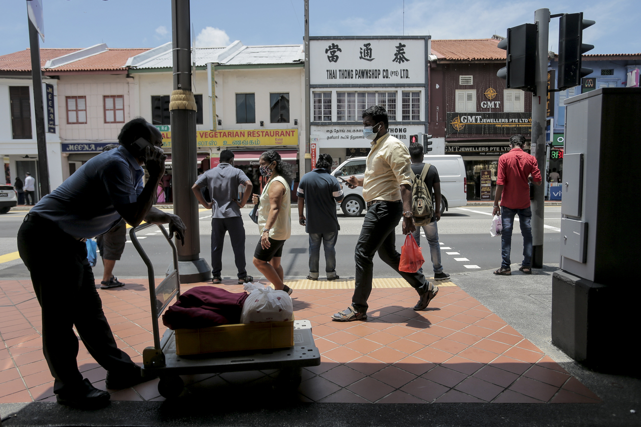 Pedestrians at a traffic junction along Serangoon Road in Little India, on Sept 5, 2021.