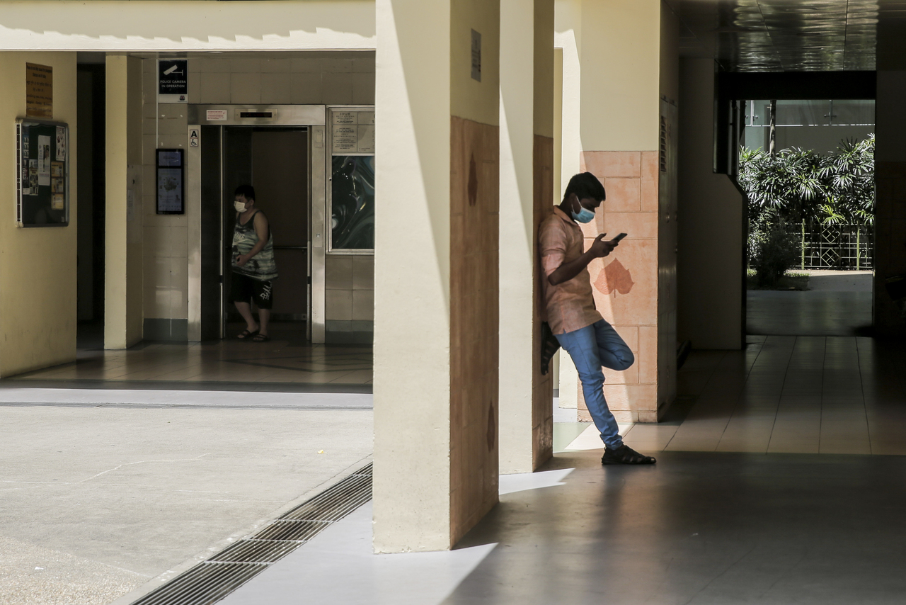 <p>wwenclaves12 ST20210905 Wallace Woon / A resident (L) exits a lift while an Indian migrant worker (R) uses his phone at the void deck of a block of flats in Klang Road, Little India, Sep 5, 2021. For story on foreign worker enclaves and how they have been changed by the pandemic and the movement restrictions imposed on the foreign work dormitory population.</p>