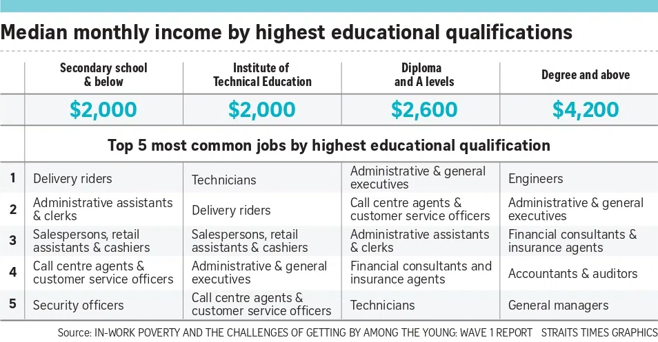 SINGAPORE - Singaporeans in their 20s and 30s who have a university degree or post-graduate degree earn a median salary of $4,200 a month – more than double the $2,000 that those with secondary and lower education and those with Institute of Technical Education (ITE) qualifications earn.
