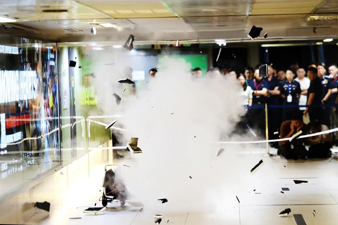The police held a multi-agency emergency preparedness exercise at Raffles MRT station which saw officers detonating a luggage bomb and taking down armed terrorists.