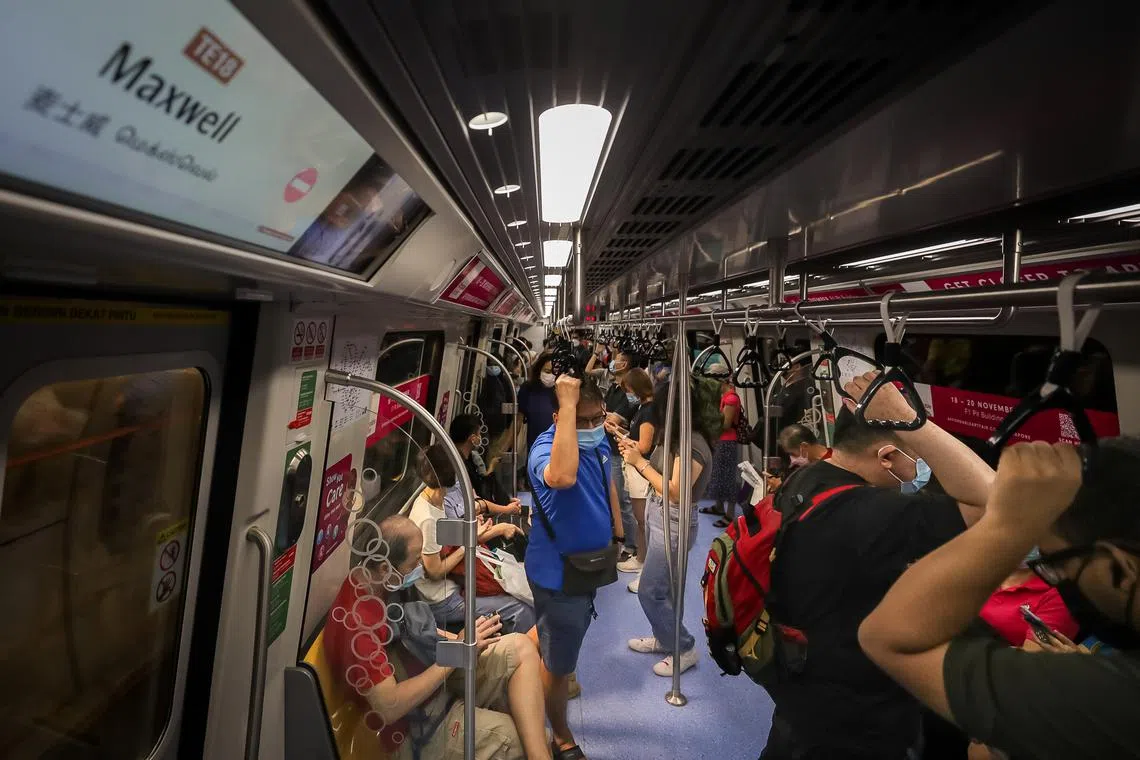Commuters on a Thomson-East Coast Line MRT train arriving at Maxwell station on Nov 11.
