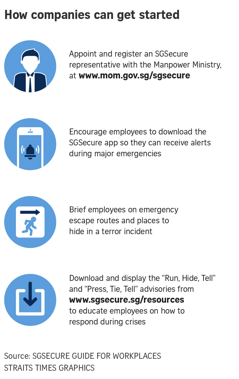 The efforts to reach businesses are part of the new SGSecure at Workplaces programme by the Ministry of Manpower (MOM), which aims to encourage 30,000 companies to register an SGSecure representative with the ministry by 2020. He or she will be the point of contact with the authorities in times of emergency, and will also receive regular information such as learning points from overseas terror incidents to share with colleagues.