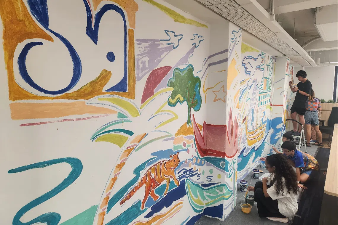 A splash of sunshine greets visitors at 8M Real Estate’s Amoy Street office, where a vibrant floor-to-ceiling mural tells a story of community and creativity. Tigers prowl among orchids while dragon boats glide across the wall in a kaleidoscope of yellows, oranges, greens and blues – all brought to life through the imagination of children from Club Rainbow, who worked alongside local artists, Ripple Root.