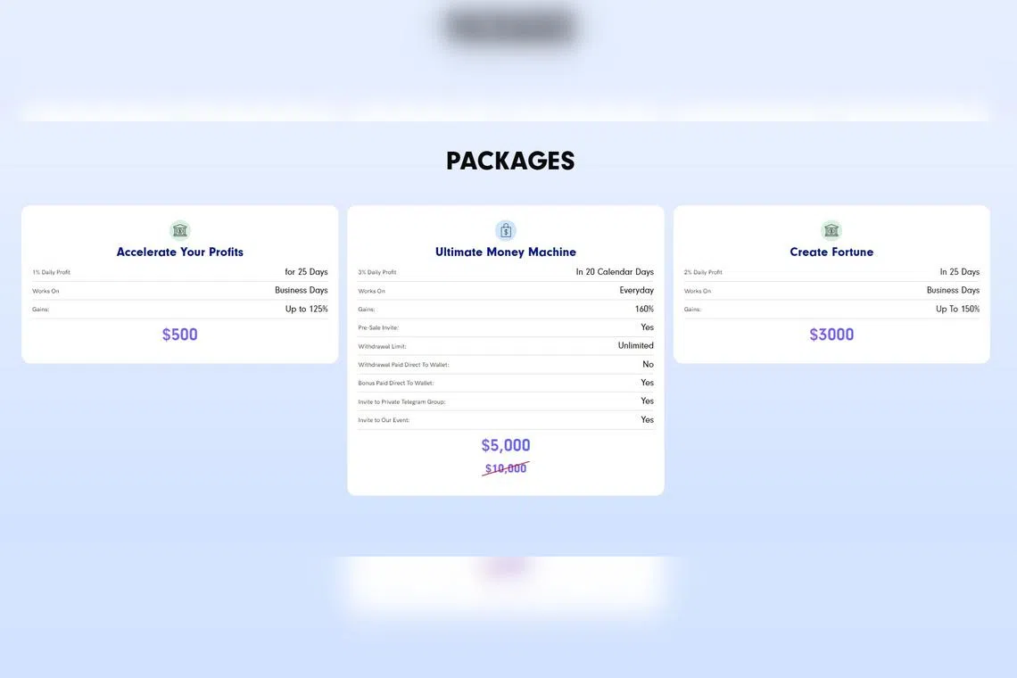 An archived version of InvesableAI’s now-defunct website lists the minimum investment at US$500, with packages that promise returns of up to 160 per cent of the principal amount in 20 days for a US$10,000 investment.