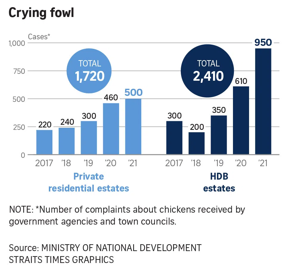 Residents in Housing Board estates made 950 reports in 2021 to the Ministry of National Development (MND), government agencies and town councils about chickens in their neighbourhoods, up from 300 in 2017.