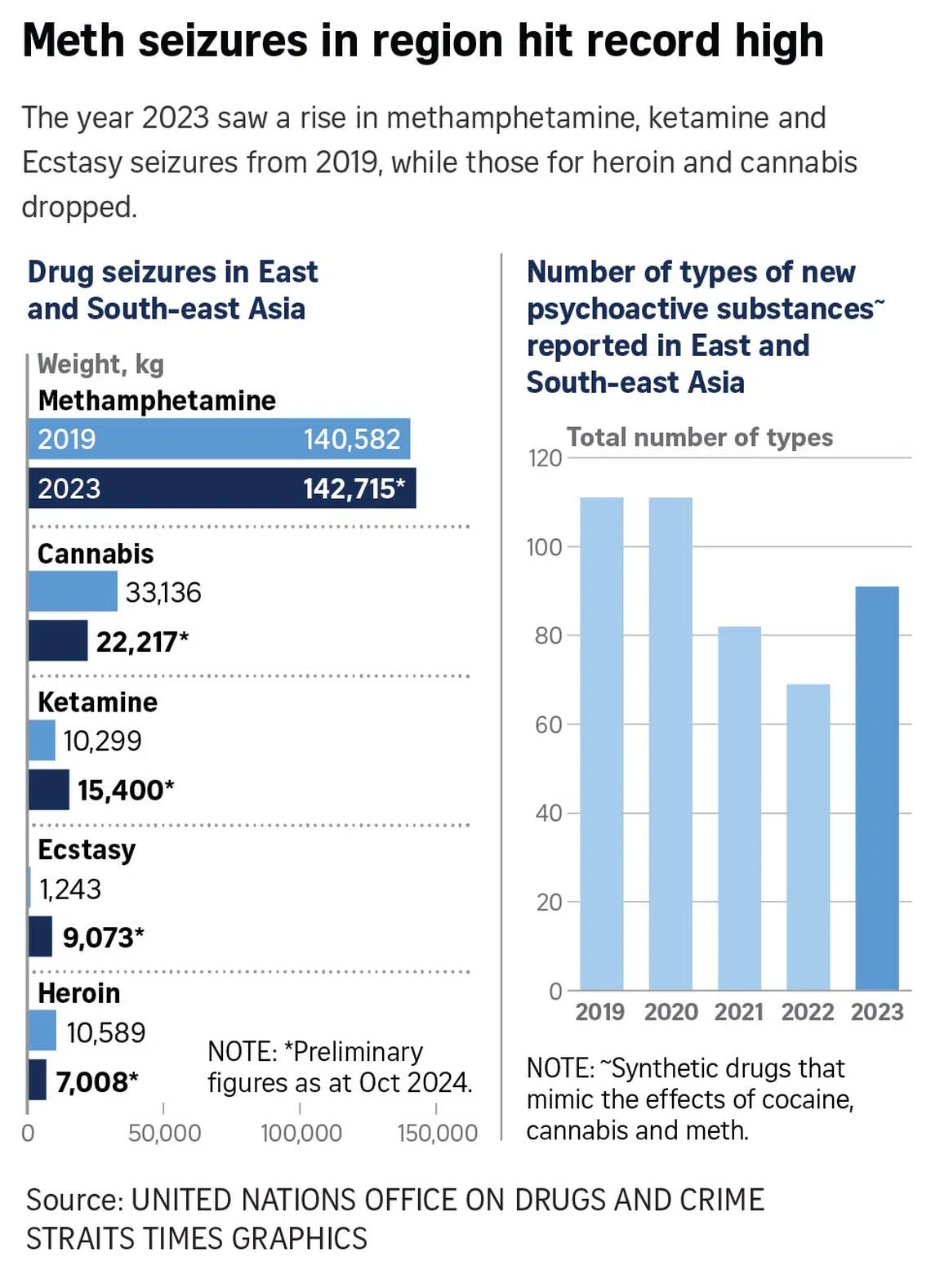According to the UNODC report, methamphetamine (in tablet, crystal and other forms) seized in East and South-east Asia rose from about 140 tonnes in 2019 to 190 tonnes in 2023, the highest amount recorded for the region.