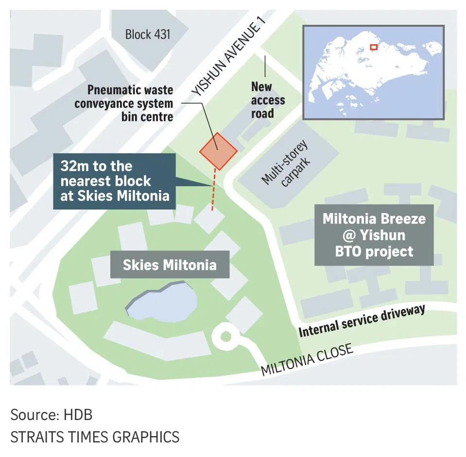 Their feedback prompted the HDB to change the orientation of the bin centre and put in a new access road for the waste removal trucks to divert them away from the Skies Miltonia condo.